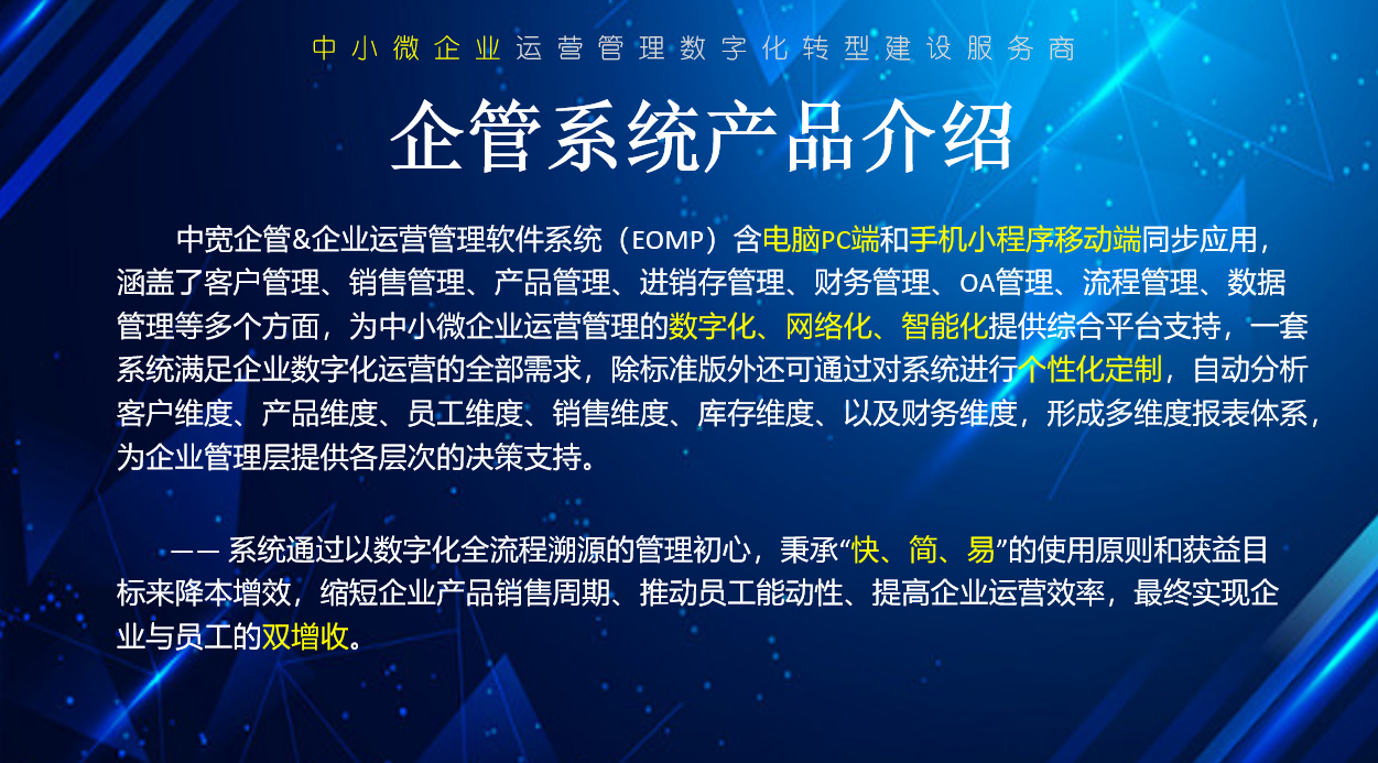 中宽企管AIEMP系统帮助企业整合多个业务系统为一体,实现数据流在企业各部门间的无缝对接。一站式满足中小微企业的所有数字化运营需求。