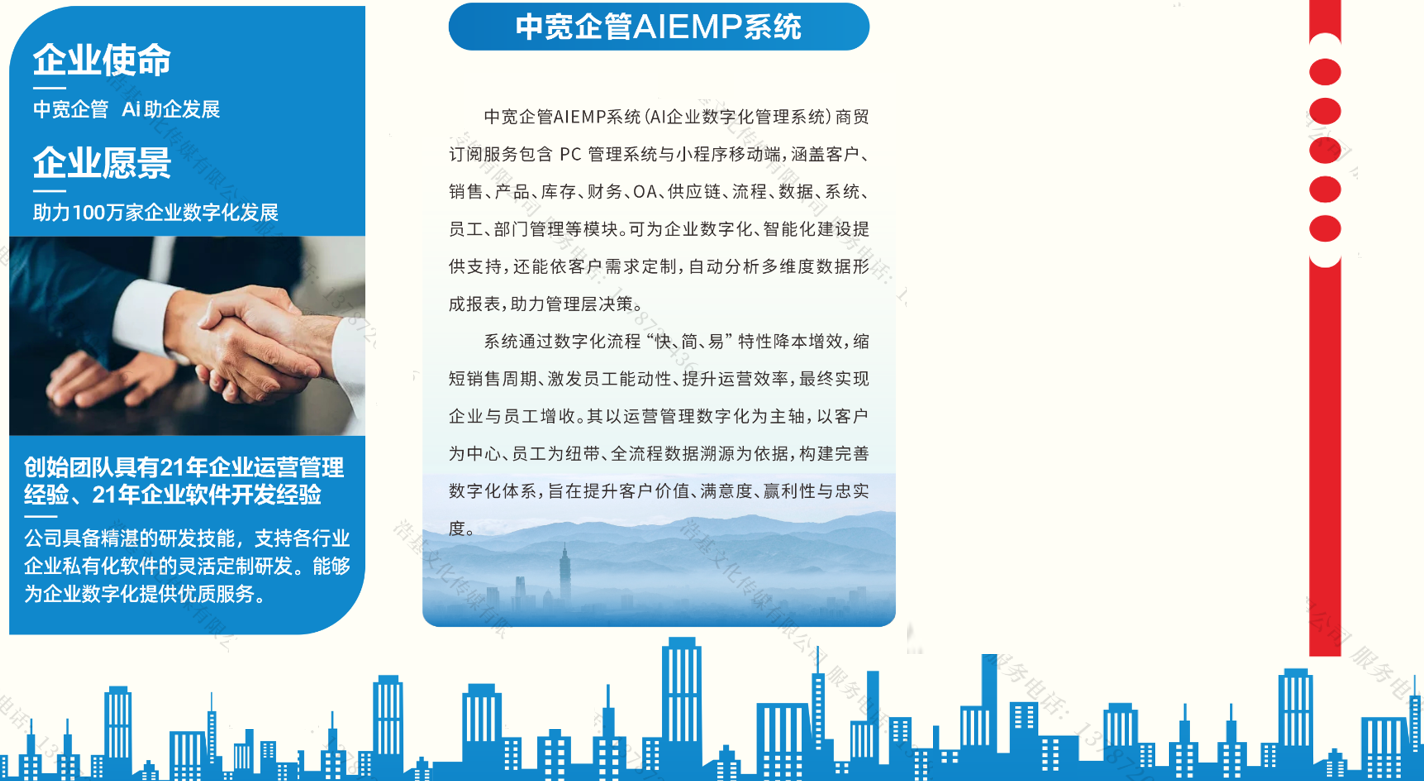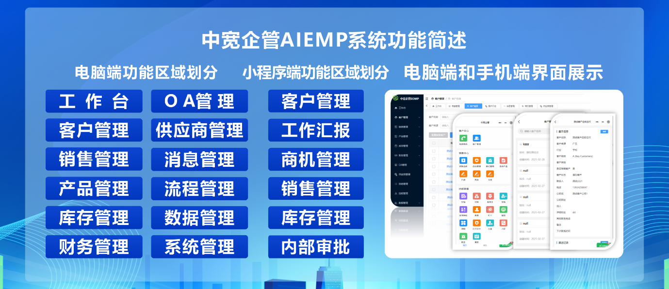 中宽企管AIEMP系统帮助企业整合多个业务系统为一体,实现数据流在企业各部门间的无缝对接。一站式满足中小微企业的所有数字化运营需求。
